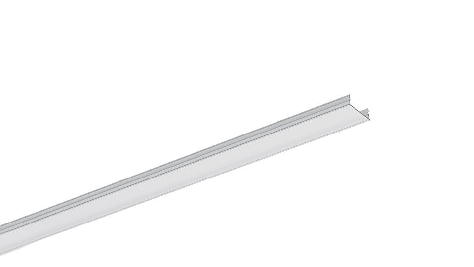 Deckenbündiges, weiß-opal satiniertes, Polycarbonatstrangpressprofil; selbstrastend.